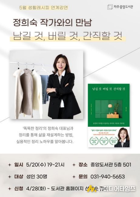 파주시 중앙도서관은 오는 5월 20일 19시, 정리 전문가 정희숙 작가를 초청한 '남길 것, 버릴 것, 간직할 것' 강연을 개최한다.