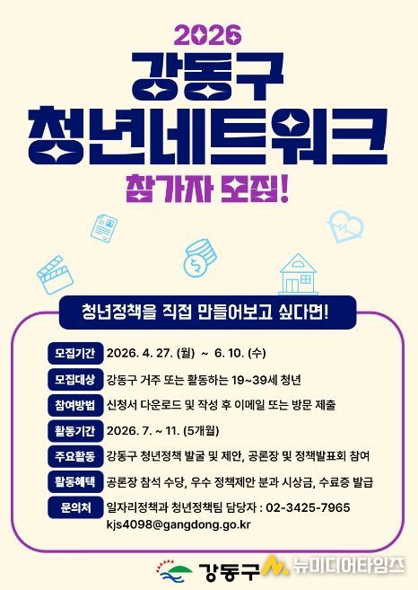 서울 강동구는 ‘2026년 강동구 청년네트워크’ 참여자를 모집한다고 밝혔다. 청년네트워크는 청년들이 직접 의제를 발굴하고 정책을 제안하는 사업이다.