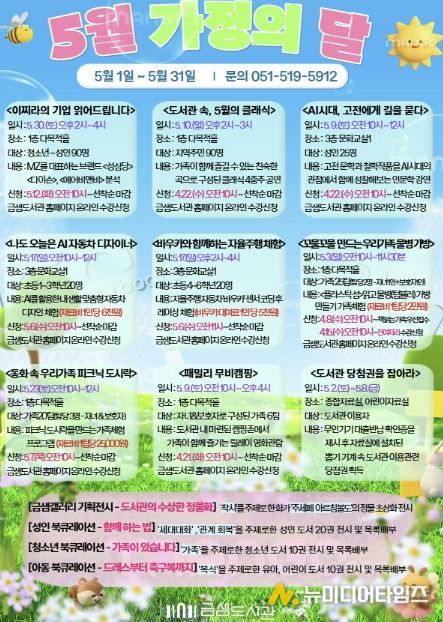 부산 금정구 금샘도서관은 5월 가정의 달을 맞아 오는 5월 1일부터 31일까지 작가(유튜버) 강연, 클래식 공연, 체험행사 등 온 가족이 함께 즐길 수 있는 '가정의 달' 특별 프로그램을 운영한다고 밝혔다.