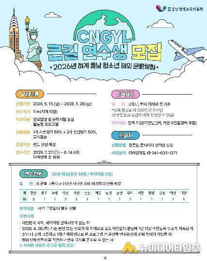 (재)충남평생교육진흥원은 도내 청소년들이 미국 현지에서 다양한 문화를 체험하고 자신의 진로를 탐색할 수 있도록'2026년 충남 청소년 해외 문화체험 큰길(CNGYL) 프로그램'하계 연수생을 모집한다.
