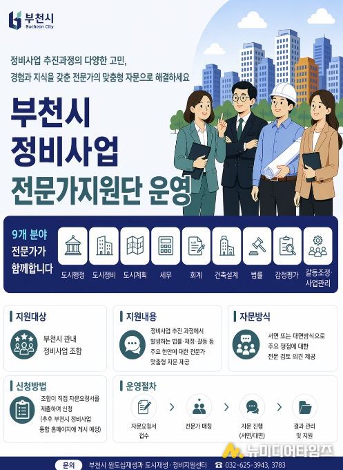 부천시 장환식 주택국장은 “정비사업은 절차가 복잡하고 이해관계가 다양해 조합이 자체적으로 해결하기 어려운 경우가 많다”며 “전문가지원단을 통해 현안에 대한 실질적인 지원을 강화하고 사업이 안정적으로 추진될 수 있도록 돕겠다”고 말했다.