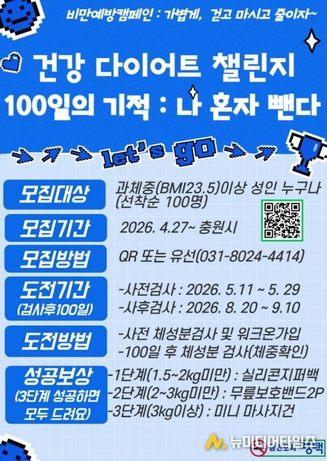 이번 챌린지는 참여자의 자발적인 의지와 실천을 최우선 가치로 둔다. 보건소는 참가자가 100일 동안 중도 포기하지 않고 스스로 건강 체중을 찾아갈 수 있도록 체계적인 환경을 조성하고 전문가의 가이드를 제공하는 ‘페이스메이커’역할을 할 예정이다.