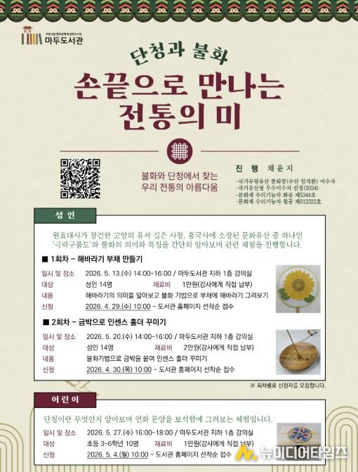 고양특례시 마두도서관은 오는 5월, 단청과 불화를 주제로 우리 전통의 아름다움을 체험할 수 있는 프로그램 ‘손끝으로 만나는 전통의 미’를 운영한다.
