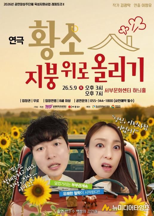(재)김해문화관광재단 김해서부문화센터는 경남문화예술진흥원이 주관하는 ‘2026 공연장상주단체 육성지원사업’에 선정되어, 오는 5월 9일 두 번째 레퍼토리 공연 연극 '황소, 지붕위로 올리기'를 선보인다.