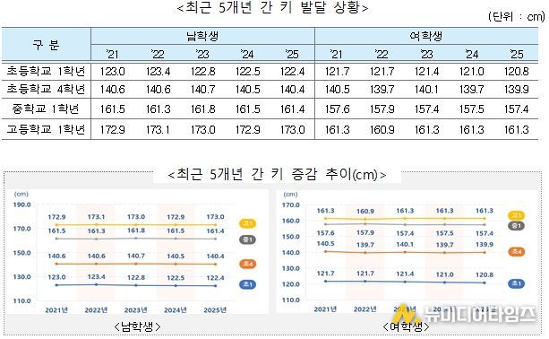 키 발달 상황을 보면, 남학생의 경우 초등학교 1학년은 122.4cm, 4학년은 140.4cm, 중학교 1학년은 161.4cm, 고등학교 1학년은 173.0cm이다. 여학생의 경우 초등학교 1학년은 120.8cm, 4학년은 139.9cm, 중학교 1학년은 157.4cm, 고등학교 1학년은 161.3cm로 남·여 학생 모두 이전 연도와 유사했다.