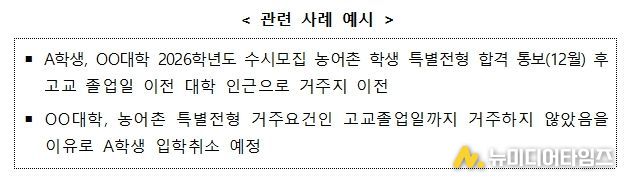 교육부는 올해 입시에서도 유사한 사례가 반복된 점을 엄중히 인식하고 지난 4월 9일 적극행정위원회의 심의를 거쳐 2026학년도 피해학생의 권리구제 및 향후 해당 사례의 재발을 막기 위한 권고사항을 대학에 안내하기로 결정했다. 특히, 농어촌 학생 특별전형 합격자가 발표된 이후의 거주지 변경은 전형 결과에 미치는 영향이 없고, 관련 판례가 일관되게 피해 학생의 권리구제를 우선하여 판시하고 있는 점을 중점적으로 고려했다.