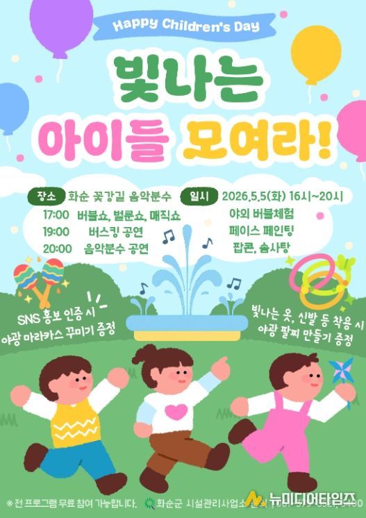 화순군은 어린이날을 맞아 아이와 가족이 함께 즐기는 대규모 체험형 축제를 마련해 ‘아동친화도시’의 면모를 한층 강화한다고 밝혔다.