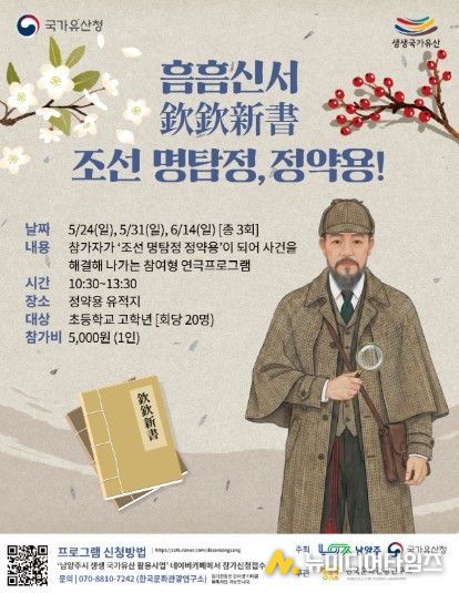 남양주시는 오는 5월 24일과 31일, 6월 14일 정약용 유적지에서 초등학교 고학년을 대상으로 참여형 연극 프로그램 ‘흠흠신서: 조선 명탐정, 정약용!’ 참가자를 모집한다고 밝혔다.