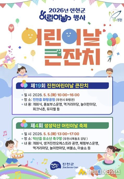 충북 진천군은 제104회 어린이날을 맞아 5월 5일 진천읍 화랑공원과 덕산읍 유소년축구장 두 곳에서 어린이날 기념행사를 개최한다고 밝혔다.