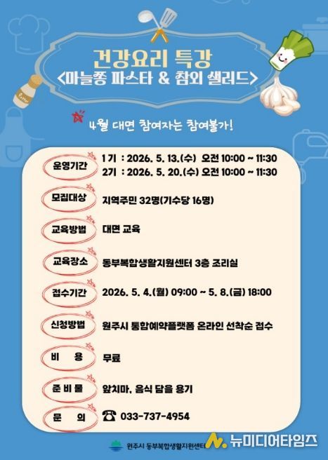 원주시 동부복합생활지원센터는 다음 달 4일부터 ‘마늘쫑 파스타·참외 샐러드 만들기’ 건강 요리 특강 프로그램 참여자를 모집한다.
