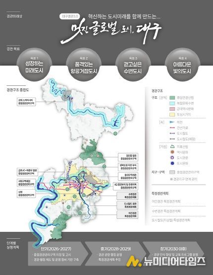 대구시는 산림·하천·도심을 유기적으로 연결하는 경관구조를 새롭게 설정했다. 시 전역을 기능과 특성에 따라 경관권역으로 구분하고, 주요 자연 및 기반시설을 잇는 경관축과 도시의 상징 공간인 경관거점을 체계화해 도시 전체를 하나의 통합된 경관 시스템으로 관리할 수 있도록 했다.