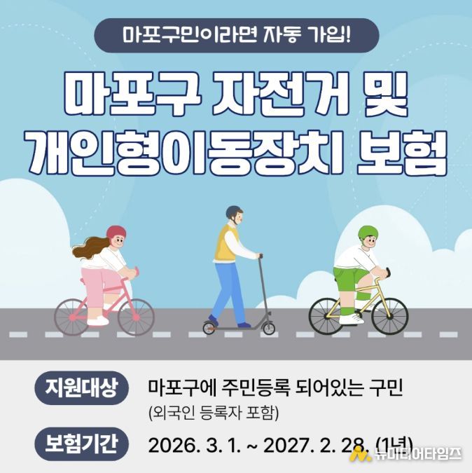 마포구는 자전거와 개인형 이동장치(PM) 이용 중 발생할 수 있는 사고로부터 구민을 보호하기 위해 ‘2026년 마포구민 자전거 및 개인형 이동장치 단체보험’을 운영한다.