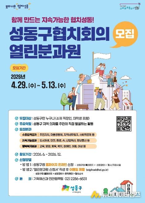 서울 성동구는 지역사회 주요 현안 해결과 민관 협치 활성화를 위해 '2026년 성동구 협치회의 열린분과원'을 4월 29일부터 5월 13일까지 15일간 모집한다고 밝혔다.