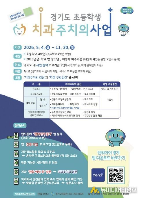 경기도 초등학생 치과주치의사업은 도내 초등학교 4학년 재학생 및 동일 연령 아동(2016년생)을 대상으로 하는 구강보건사업이다. 대상자는 ‘일반 학생 구강검진’ 또는 ‘치과주치의 검진’ 중 하나를 선택해 치과 의료 서비스를 받을 수 있다.