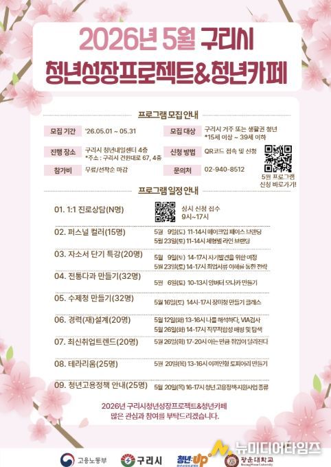 구리시 관계자는 “이번 5월 프로그램은 청년들이 자신을 발견하고, 내일을 설계하며, 지역 안에서 함께 성장할 수 있도록 준비한 자리”라며 “진로와 취업을 고민하는 청년은 물론, 새로운 경험과 교류를 원하는 청년들의 많은 관심과 참여를 바란다.”라고 말했다.