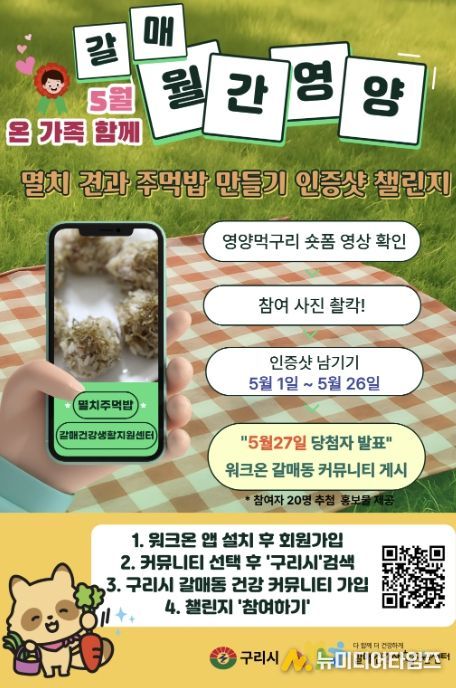 구리시 갈매건강생활지원센터는 오는 5월 1일부터 5월 26일까지 주민 주도형 식습관 개선 사업의 일환으로 ‘우리 가족 뼈 건강 지킴이! 멸치 견과 주먹밥 만들기 인증 사진 참여 잇기(챌린지)’를 추진한다고 밝혔다.