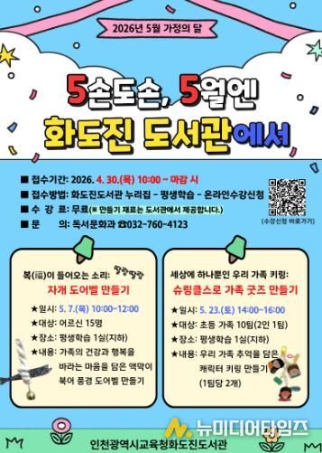 인천광역시교육청화도진도서관은 5월 가정의 달을 맞아 유·초등생 동반 가족과 어르신을 대상으로 세대 맞춤형 프로그램 ‘5손도손, 5월엔 화도진도서관에서’를 운영한다.
