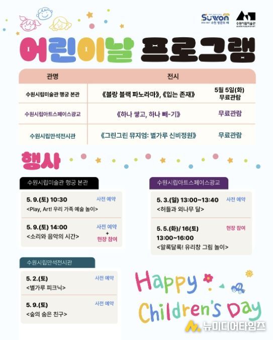 경기도 수원시립미술관은 2026년 어린이날을 맞아 수원시립미술관 행궁 본관, 수원시립아트스페이스광교, 수원시립만석전시관에서 즐거운 하루를 보낼 수 있는 전시와 다양한 프로그램을 운영한다.