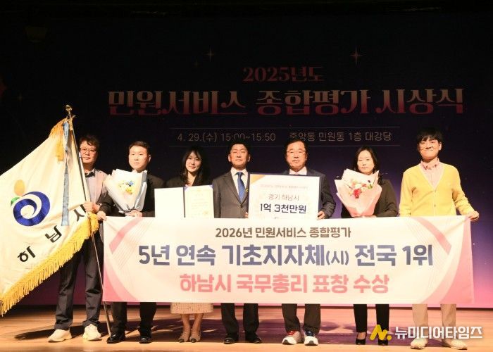 하남시가 전국 기초자치단체 중 최고 수준의 민원서비스 역량을 인정받으며 5년 연속 최우수 기관으로 선정됐다. 하남시는 29일 정부세종청사에서 열린 ‘2025년 민원서비스 종합평가’ 우수기관 시상식에서 국무총리 표창을 수상했다고 밝혔다.