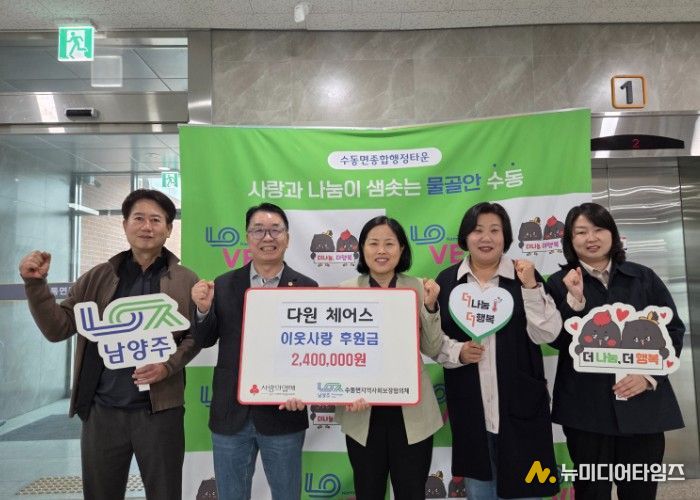 남양주시는 지난 28일 수동면 소재 다원체어스가 수동면 어르신들을 위한 후원금 240만 원을 수동면 지역사회보장협의체에 전달했다고 29일 밝혔다.