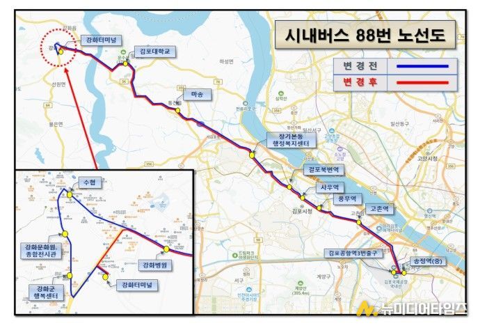 김포시가 5월 1일부터 시내버스 88번 노선의 강화군 구간을 변경 운행한다고 밝혔다.