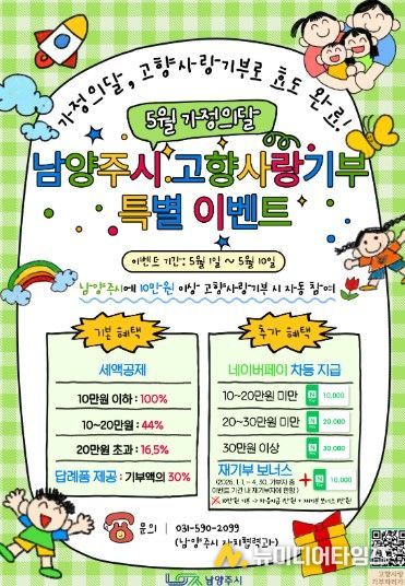 남양주시는 가정의 달을 맞아 5월 1일부터 10일까지 고향사랑기부 특별선물 증정 이벤트를 추진한다고 30일 밝혔다.