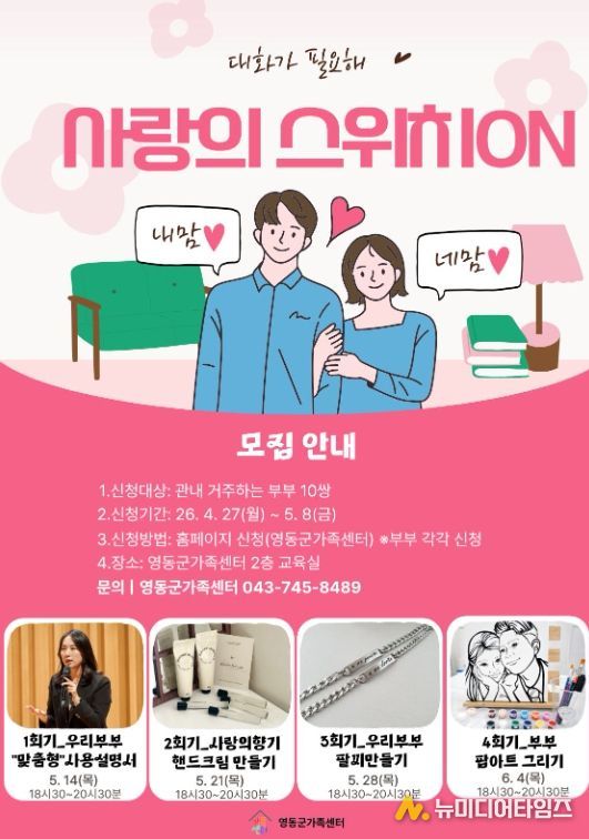 충북 영동군가족센터는 부부간 소통과 관계 증진을 돕기 위한 프로그램 ‘사랑의 스위치 ON’ 참여자를 모집한다고 밝혔다.