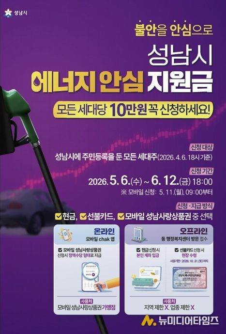 성남시는 중동 사태에 따른 국가 자원안보 위기 경보 발령으로 경제적 부담이 커진 시민들을 지원하기 위해 전국 최초로 ‘성남시 에너지 안심지원금’을 오는 5월 6일부터 신청을 받는다고 밝혔다.