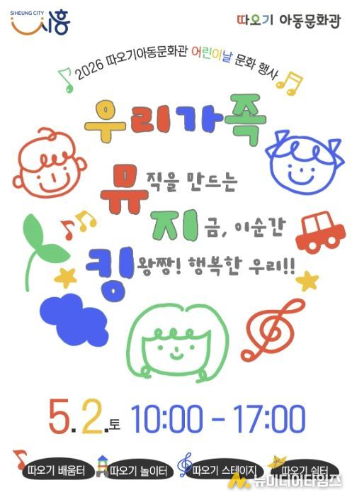시흥시 따오기아동문화관은 어린이날을 맞아 오는 5월 2일 오전 10시부터 오후 5시까지 따오기아동문화관 야외 일대에서 2026년 어린이날 문화행사 ‘우리가족 뮤지킹’을 개최한다.