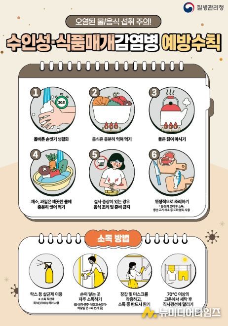 수인성ㆍ식품매개감염병은 병원성 세균, 바이러스, 원충에 오염된 물이나 식품을 섭취해 구토, 설사, 복통 등의 장관 증상을 유발한다. 이를 예방하기 위해서는 ▲올바른 손 씻기 생활화 ▲음식 충분히 익혀 먹기 ▲물 끓여 마시기 ▲채소ㆍ과일 깨끗한 물에 충분히 씻어 먹기 ▲설사 증상 시 음식 조리 및 준비 금지 ▲위생적으로 조리하기 등 예방수칙을 준수해야 한다.