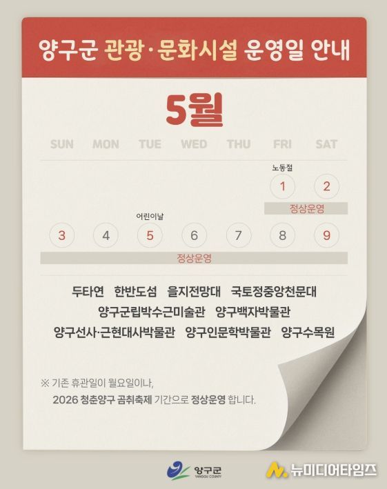 양구군은 ‘2026 청춘양구 곰취축제’ 기간 동안 관광객 편의 증진과 지역 관광 활성화를 위해 관내 주요 관광·문화시설을 휴관일 없이 정상 운영한다.