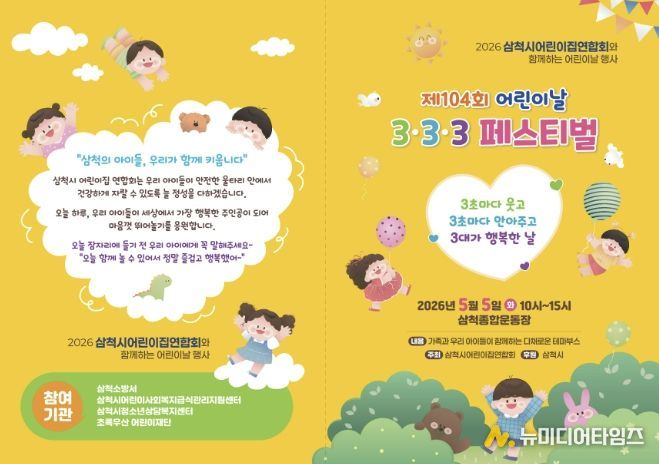 먼저 어린이날인 5월 5일 삼척시어린이집연합회 주관으로 삼척 종합운동장에서 “3초마다 웃고 3초마다 안아주고 3대가 행복한 날”이라는 주제로 ‘제104회 어린이날 3ㆍ3ㆍ3 페스티벌’을 개최한다.