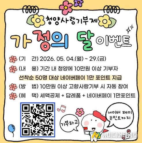 청양군이 가정의 달 5월을 맞아 고향사랑기부제 활성화와 기부 참여 확대를 위해 오는 5월 4일부터 29일까지 ‘가정의 달 감사 이벤트’를 진행한다.