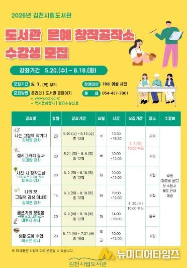 수강 신청은 5월 7일부터 김천시립도서관 누리집을 통해 선착순으로 진행되며, 수강료는 무료(교재․재료비 본인 부담)이다.