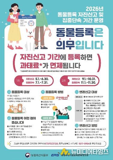 대구광역시는 반려견의 유기·유실을 방지하고 보호자의 책임 의식을 강화하기 위해 5월 1일부터 6월 30일까지 두 달간 ‘2026년 상반기 반려견 동물등록 자진신고 기간’을 운영한다.