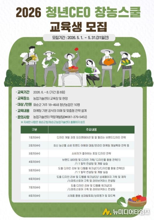 화순군은 지역 청년농업인의 전문 경영 역량 강화를 위해 ‘2026 청년CEO 창농스쿨’ 교육생을 오는 5월 1일부터 31일까지 모집한다고 밝혔다.