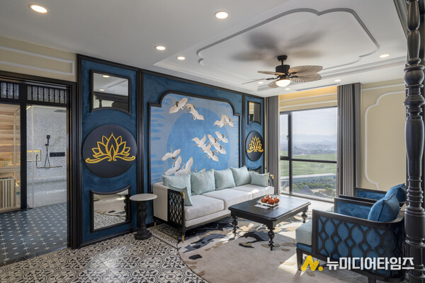 프레지덴셜 스위트는 전통적인 베트남의 우아함과 현대적인 세련미가 완벽하게 조화를 이루는 프라이빗 안식처다. 넓고 아름답게 꾸며진 거실과 4개의 단독 침실로 구성되어 있어 궁극의 휴식을 위한 충분한 공간을 제공한다. 각 객실은 로열 블루 색상과 세심한 디테일을 통해 고급스럽고 고요하며 우아한 분위기를 연출하는 디자인의 걸작이다.