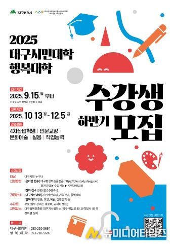 대구광역시는 오는 9월 15일부터 ‘2025 하반기 시민대학․행복대학’ 수강생을 모집한다. 이번 학기에는 시민대학 42개, 행복대학 36개 등 총 78개 강좌가 개설된다.
