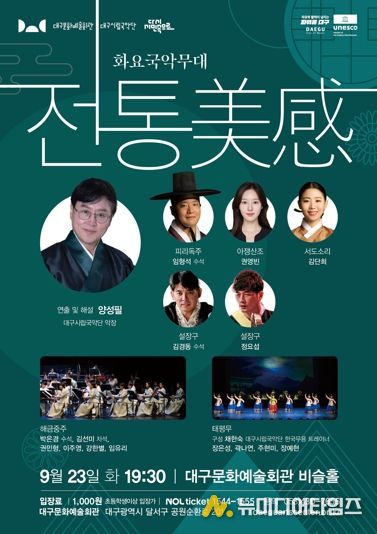 대구시립국악단 화요국악무대 '전통 美感' 공연이 9월 23일 저녁 7시 30분 대구문화예술회관 비슬홀에서 펼쳐진다.