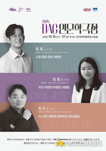 (재)대구문화예술진흥원 문화예술회관은 인문학으로 시민들의 문화적 정서 함양과 인간다운 삶의 가치를 제공하기 위한 공개 강연인 2025 DAC 인문학극장을 오는 10월 15일부터 17일까지 오후 7시 30분 3일간 대구문화예술회관 비슬홀에서 개최한다.