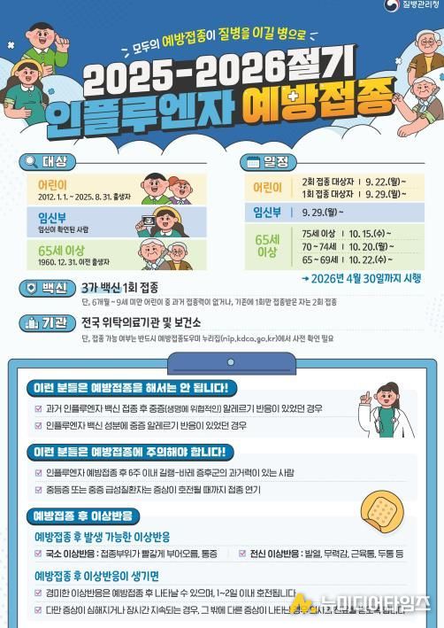 우선 22일 2회 접종 대상 어린이를 시작으로, ▲9월 29일, 어린이(1회 접종 대상)와 임신부 ▲10월 15일, 75세 이상 어르신 ▲10월 20일, 70~74세 어르신 ▲10월 22일, 65~69세 어르신의 접종이 이뤄지며, 모든 대상군 접종은 2026년 4월 30일까지 이어질 예정이다.