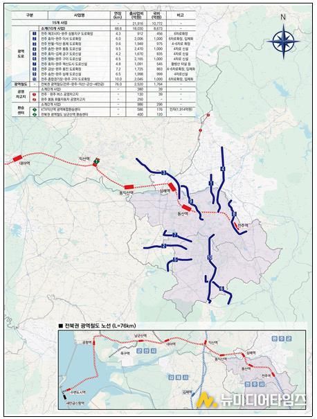 이번 사업 계획에는 △전주 중심 방사형 광역도로망 10개 노선(신설 5개, 확장 5개, 총연장 69㎞) △전주~새만금을 잇는 광역철도(76㎞, 9개 정차역) △버스·화물 공영차고지 2곳 △환승센터 2곳 조성 등 15개 핵심사업이 담겼다.
