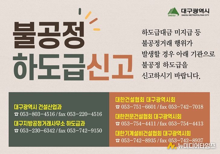 아울러 대구시는 9월 15일부터 10월 2일까지 ‘불공정하도급 신고센터’를 집중 운영하고 홍보 유인물(스티커)을 배포하는 등 하도급대금 체불 및 지연 지급과 같은 불공정행위 예방에 최선을 다할 예정이다.