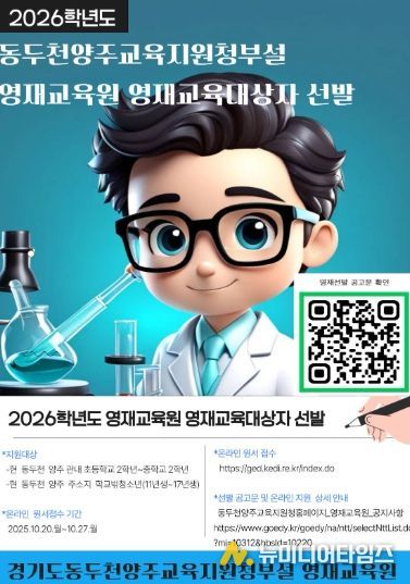 동두천양주교육지원청은 2026학년도 영재교육대상자 140명을 모집한다. 선발은 7개 프로그램 영역에서 진행되며, 현재 지원 자격 대상은 동두천 및 양주 관내 초등학교 2학년부터 중학교 2학년 학생이다.