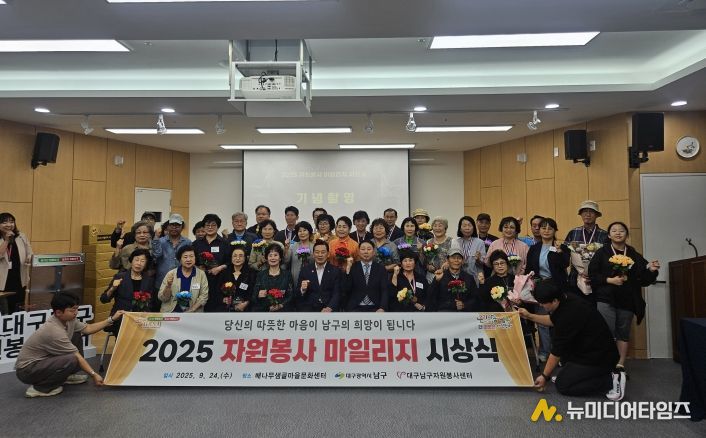 대구 남구는 대구 남구자원봉사센터(센터장 이창지)와 함께 지난 9월 24일, '2025 자원봉사 마일리지 시상식'을 열고 한 해와 오랜 세월 동안 지역사회를 위해 헌신해 온 우수 자원봉사자들에게 인증메달, 공로패, 핸드프린팅을 수여했다.