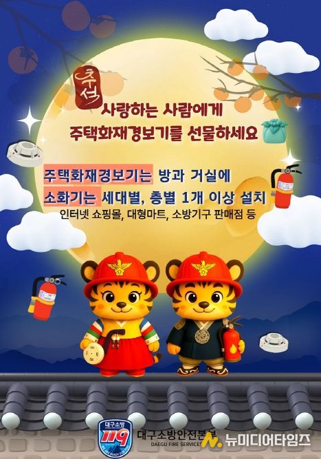 엄준욱 대구소방안전본부장은 “화재는 초기 대응이 무엇보다 중요하다. 주택용 소방시설은 가족과 이웃을 지키는 가장 확실한 안전장치”라며, “이번 추석에는 소중한 분들께 안전을 선물하시고, 시민 모두가 평안한 명절을 보내시길 바란다”고 전했다.