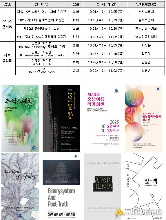 삼거리 갤러리에서는 ▲10월 1~ 5일, 제4회 추억스케치 어반수채화 정기전 ▲10월 15~ 19일, 2025 제16회 성호묵연회 회원전 ▲10월 22~ 26일, 제30회 충남여류작가회전 ▲10월 29일~ 11월 2일, 2025 제41회 충남한국화협회 정기전이 열린다.