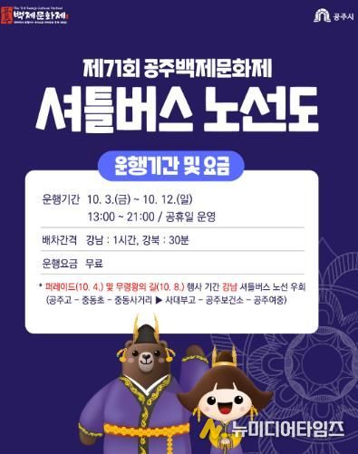 공주시는 오는 10월 3일부터 12일까지 열리는 ‘제71회 백제문화제’ 기간 동안 관람객들의 원활한 이동을 돕기 위해 무료 셔틀버스를 운영한다고 밝혔다.