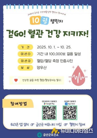 금산군보건소는 사진인증으로 함께하는 2025 건강생활실천 ‘걷고(GO)! 혈관 건강 지키자!’ 챌린지를 오는 25일까지 진행한다.