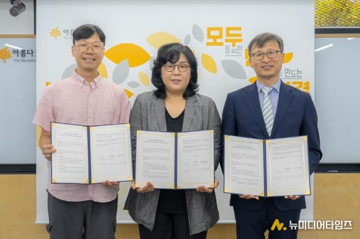 지난달 30일 서울 종로구 아름다운재단에서 열린 협약식에는 공정식 경기도 사회혁신경제국장, 김진아 아름다운재단 사무총장, 김정태 MYSC 대표가 참석했다.